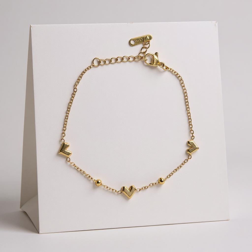 The ORIGAMI Heart Bracelet features delicate chain links adorned with three polished origami heart charms and subtle gold beads, this piece is perfect for layering or wearing solo.
