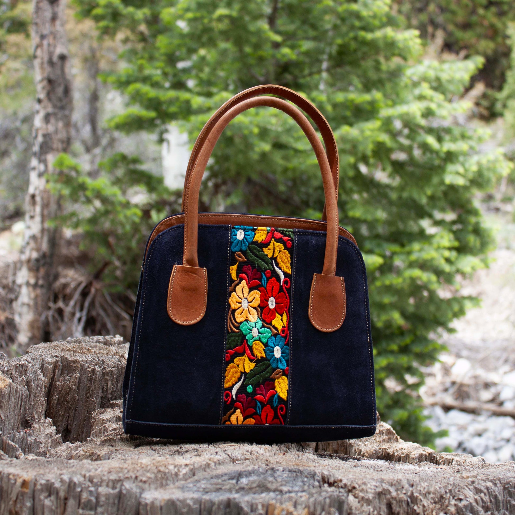 The ITZA mini tote bag has a unique handcrafted embroidered design and dual top handles.  This bag has a suede leather body.  It features a vibrant floral pattern inspired by Indigenous textile art.