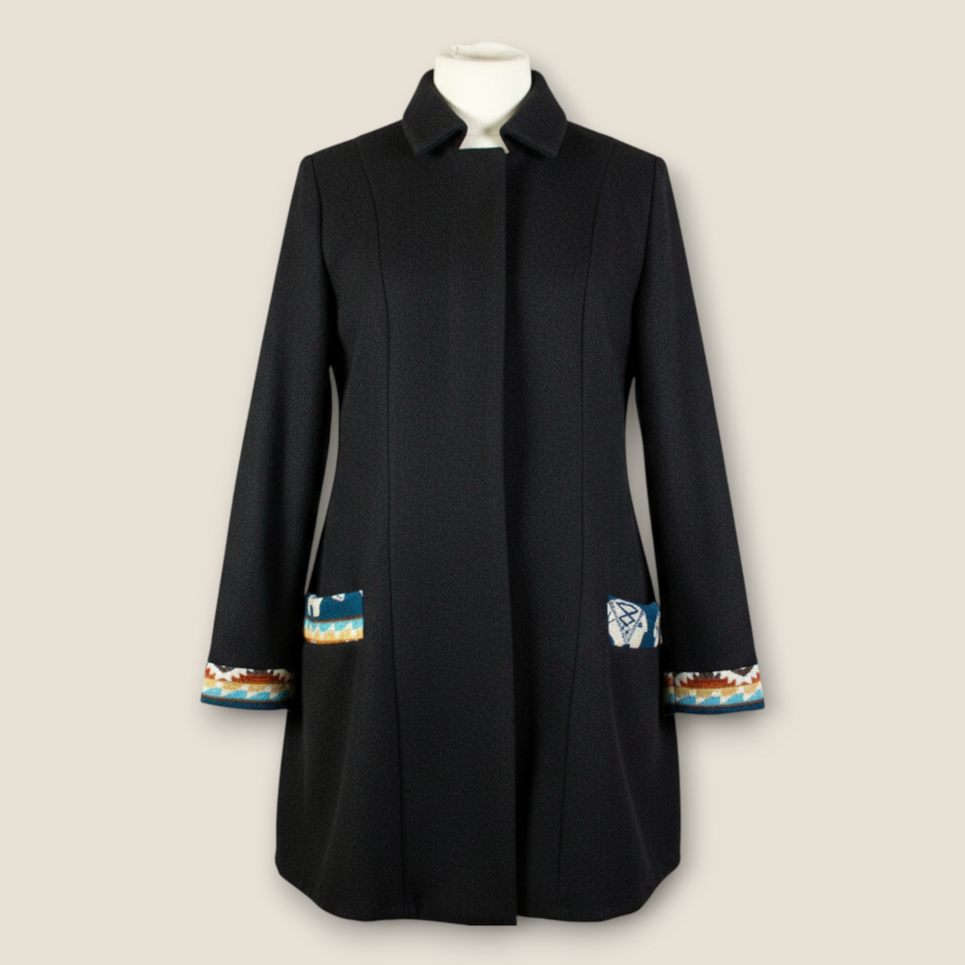 Step out in style with this sleek black long coat, inspired by Ecuadorian flair. Perfect for adding a touch of mystery and elegance to any outfit, it’s your go-to for cool days and even cooler vibes. Wrap yourself in warmth and confidence—because who says coats can’t be fun?