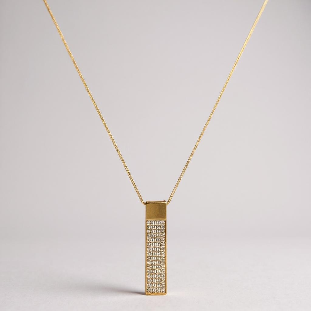 Our LUZIA Necklace features a sleek vertical bar design plated in radiant gold, this piece is adorned with a grid of sparkling stones that catch the light with every movement. Minimalist yet striking, the pendant rests gracefully on a delicate chain, making it the perfect balance between modern sophistication and timeless charm. Wear it solo for understated elegance or layer it for a bold statement.