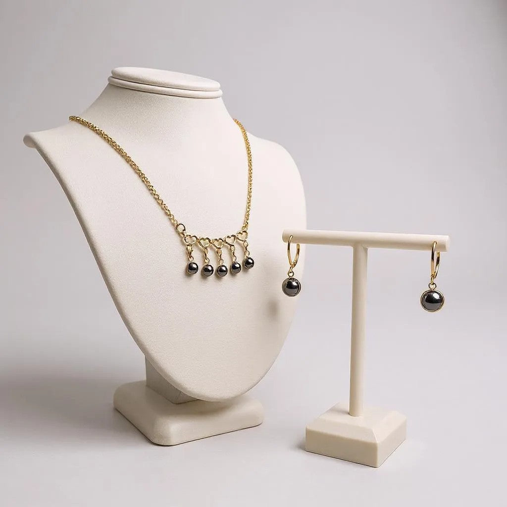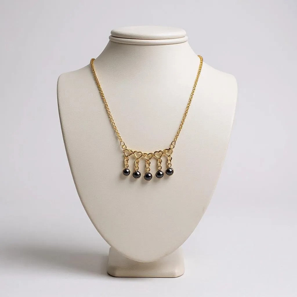 The MIDNIGHT Jewelry Set is a timeless pairing of elegance and romance. Delicate golden hearts create a graceful cascade, each one holding a luminous black pearl that sways with subtle charm. This matching necklace and earring set celebrates both strength and tenderness—perfect for moments when you want to shine with sophistication and love.