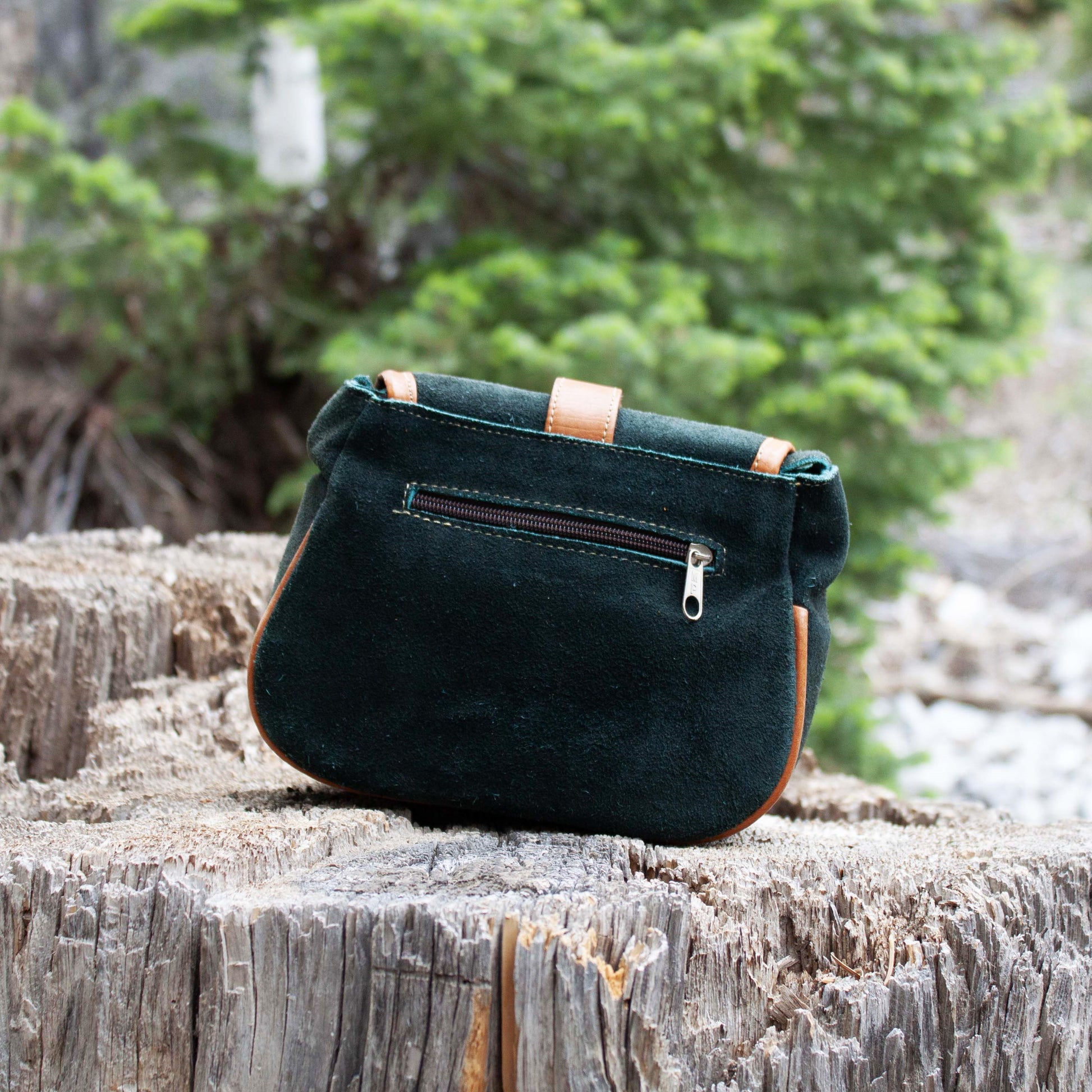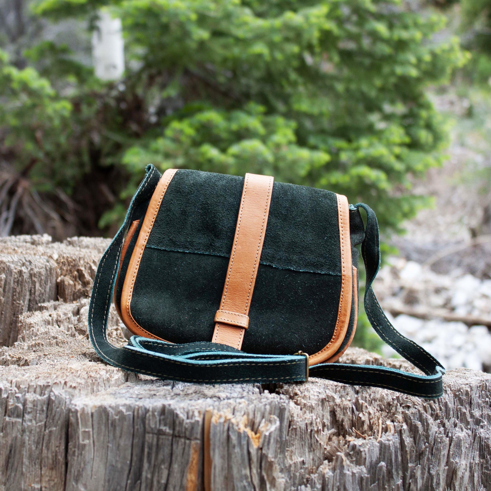 The NAWI compact leather suede crossbody bag features a rich dark green body complemented by smooth camel-toned leather trim. Its curved silhouette and clean lines lend a modern yet rooted feel — perfect for day-to-night transitions.