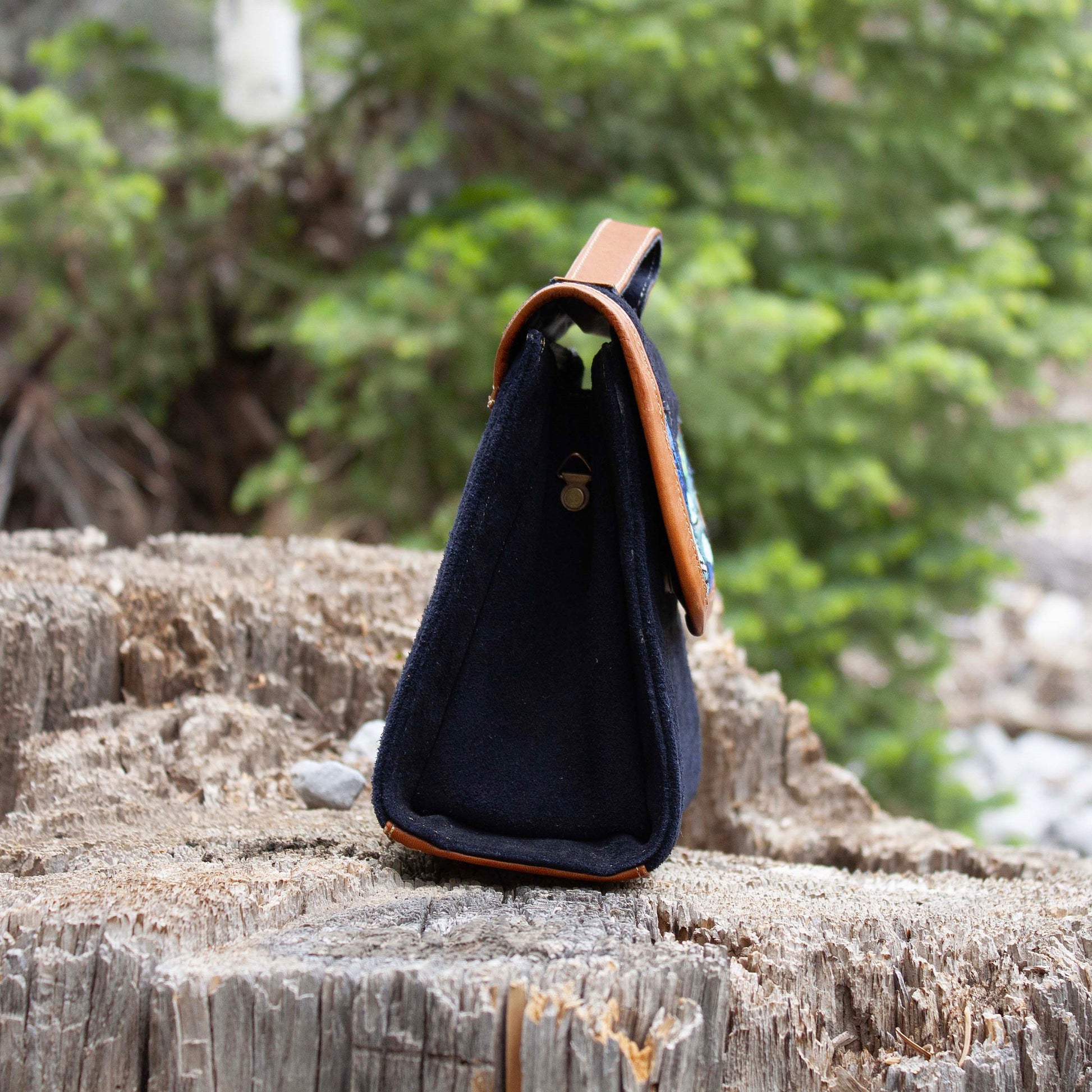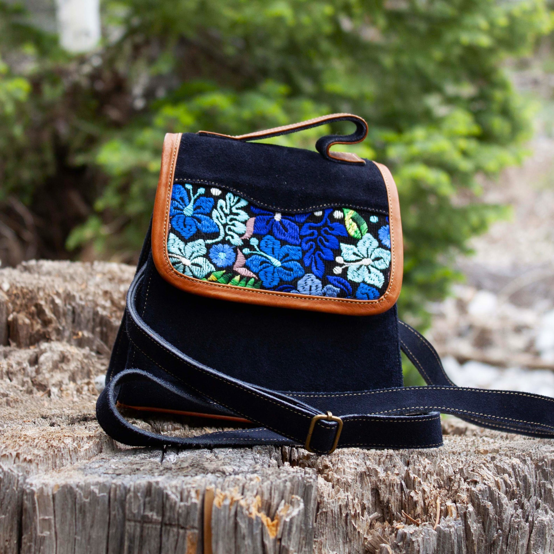 The NIMA satchel bag features a flap closure, a top handle and a removable shoulder strap. This bag has a suede leather body with a colorful embroidered pattern on the flap. This bag is very versatile and can be use from work to casual outings.