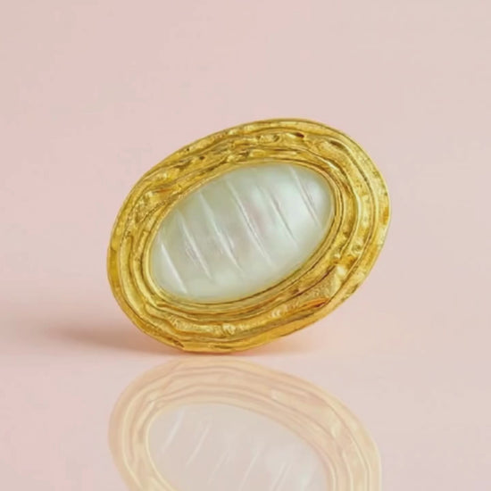 Our PERLA Brooch, featuring an elegant oval-shaped pearl nestled in a lustrous 18k gold-plated frame. Crafted from tarnish-free stainless steel and waterproof materials, this sophisticated accessory promises lasting shine and durability, perfect for refining your look effortlessly.