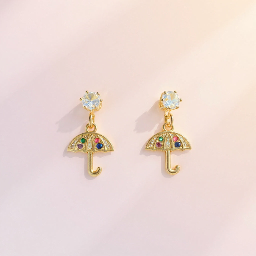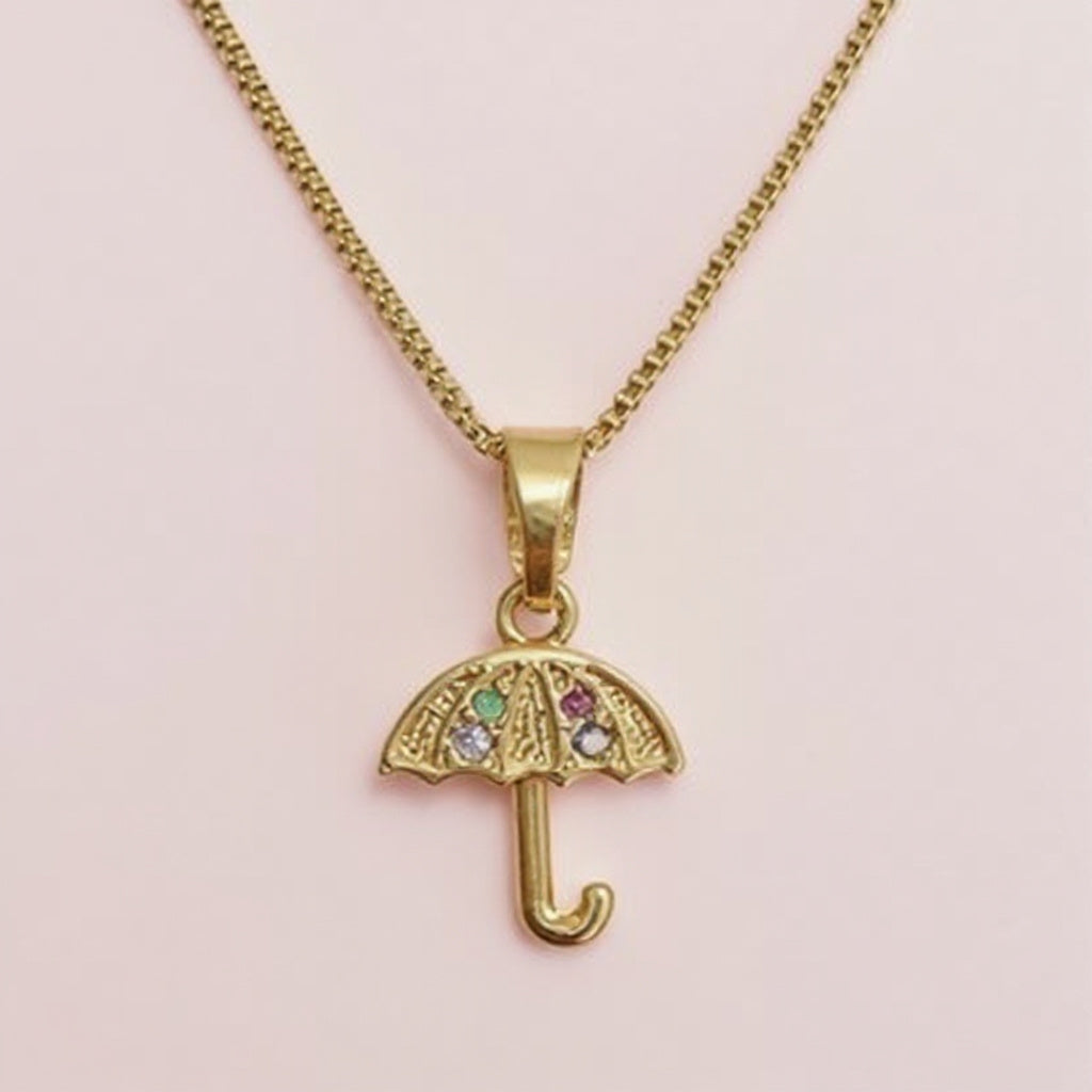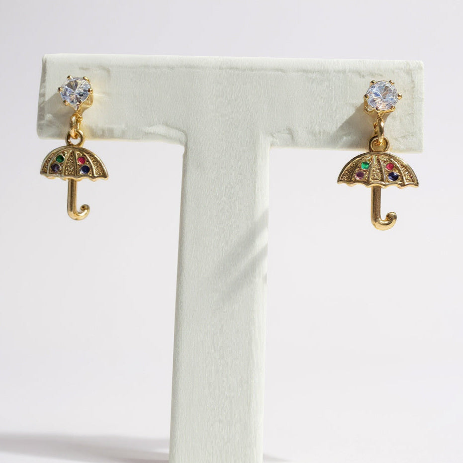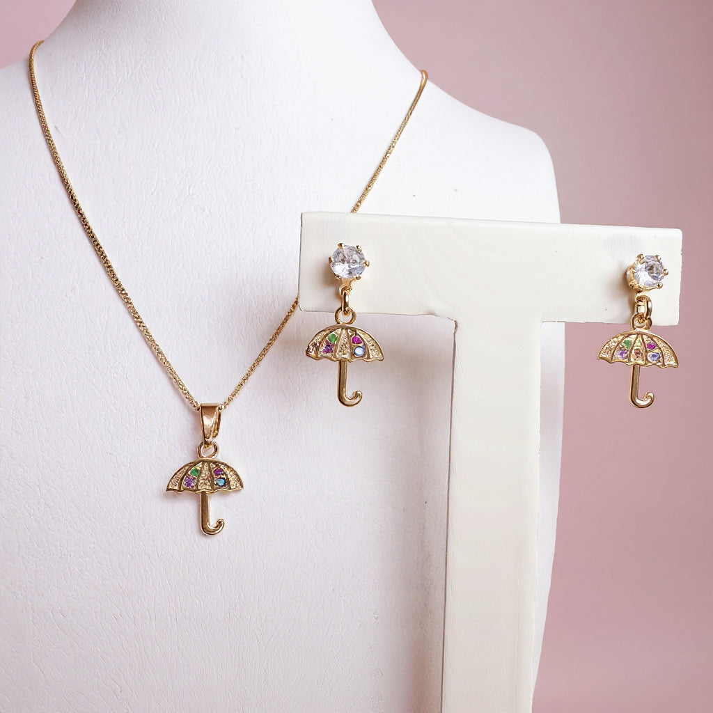This Earring and Necklace set feature a charming umbrella shaped pendant and matching dangle earrings both adorned with sparkling colorful rhinestones that shimmer like raindrops. This set is lightweight and comfortable.