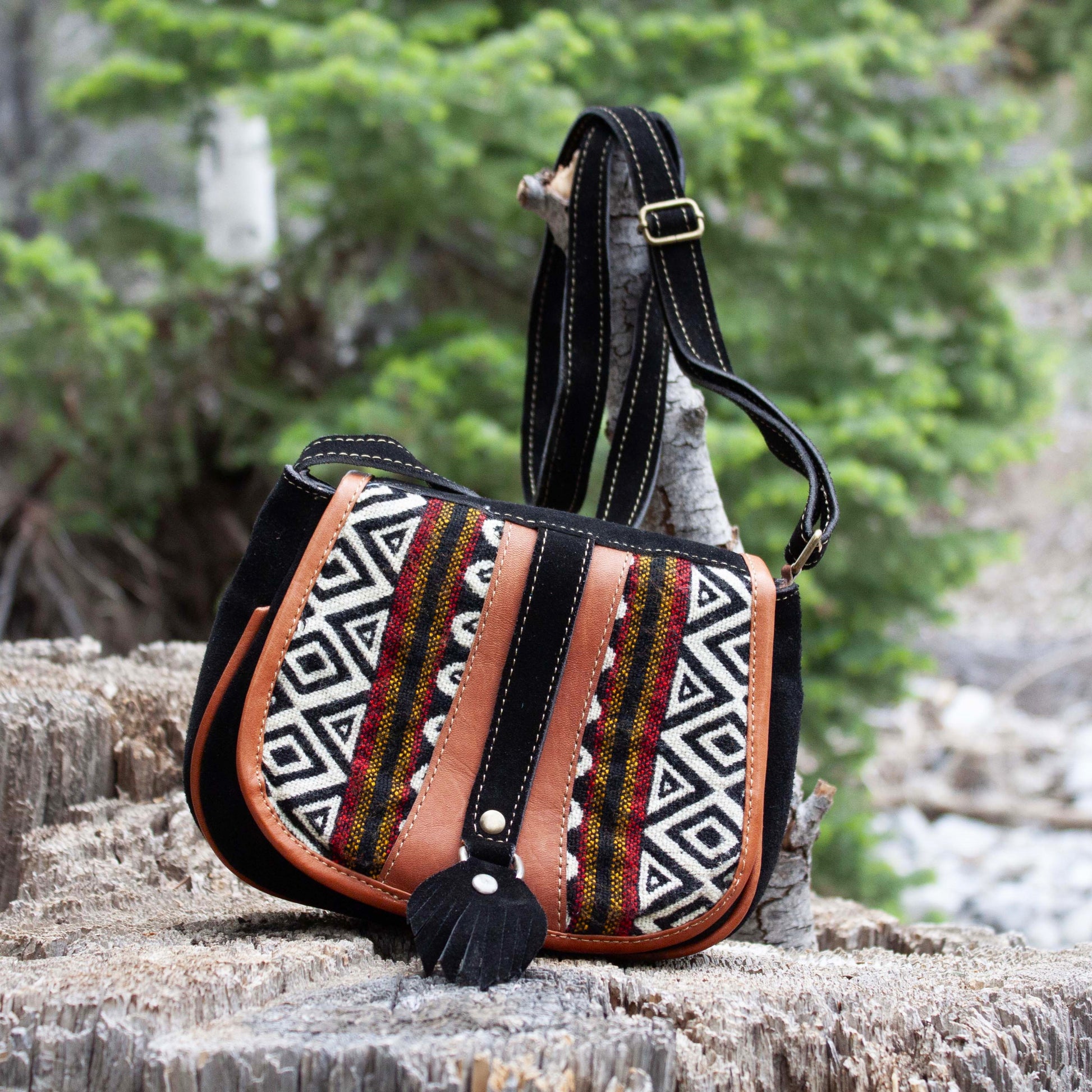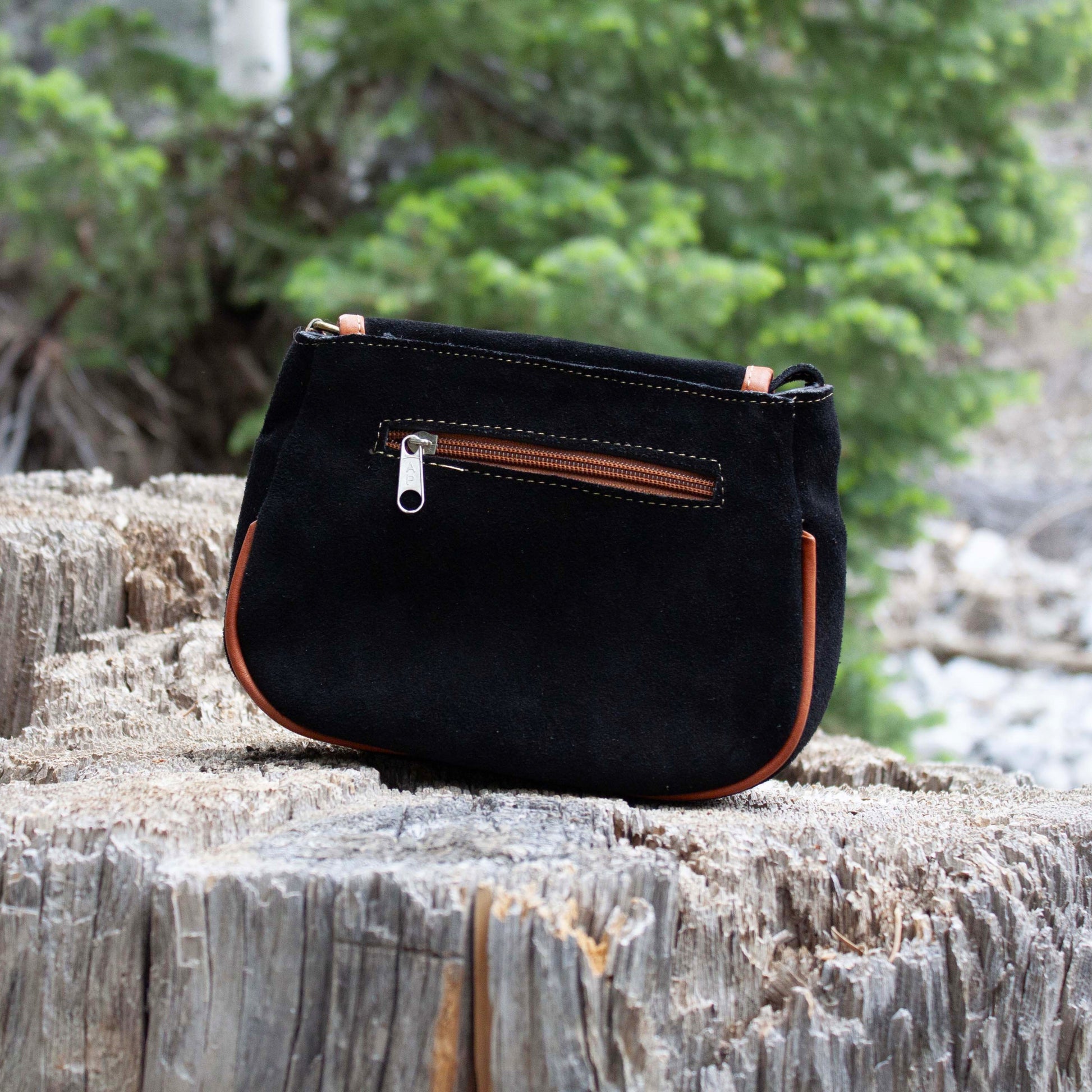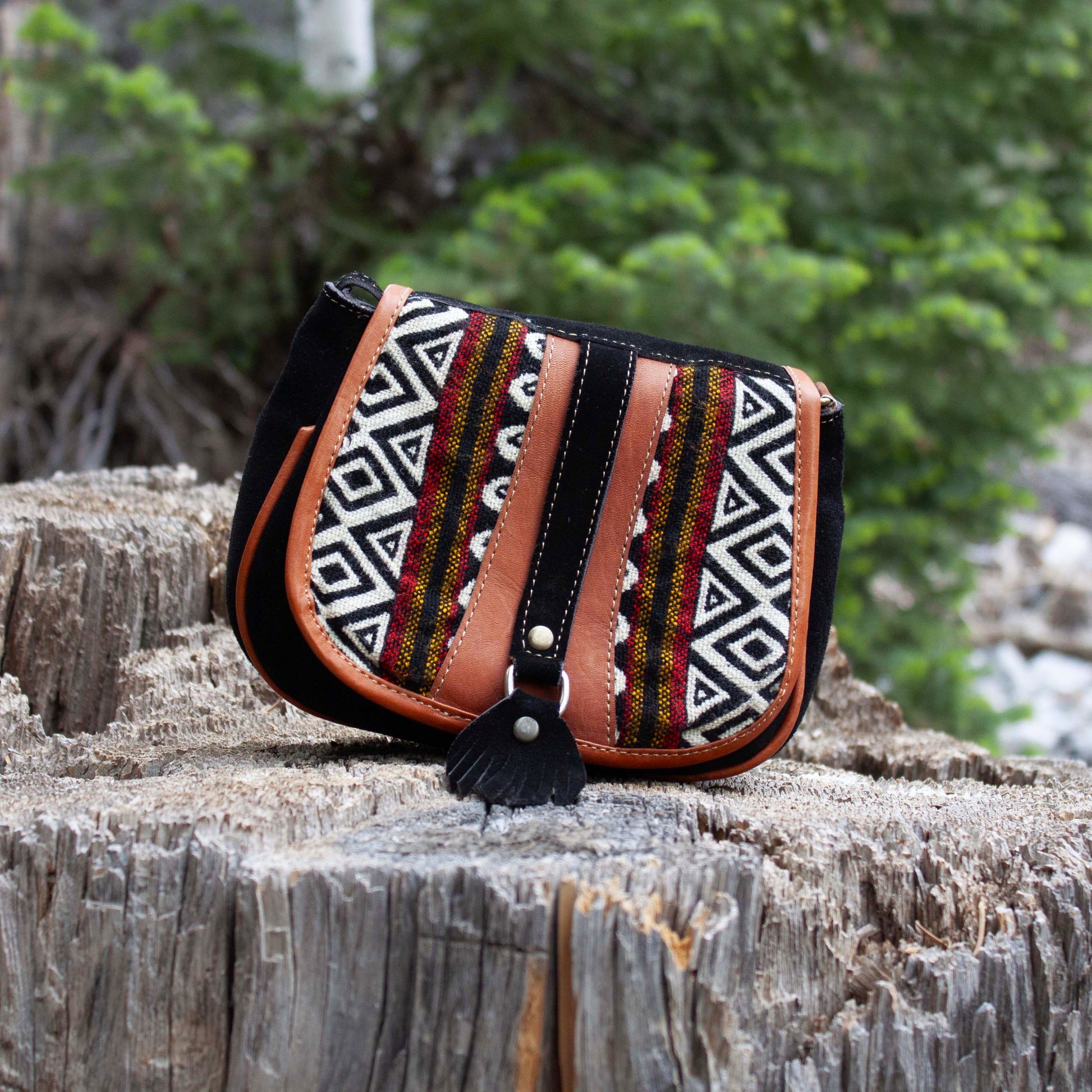 The Zuni crossbody bag features a suede leather body with an Indigenous inspired pattern and a tassel accessory on the flap giving it a unique ethnic country look. This bag is perfect for a casual summer festival or a fall/winter event.